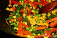 Na rozgrzanej patelni lub w woku, skropionej oliwą lub olejem, podsmażamy najpierw marchew, potem dodajemy paprykę i fasolę/szparagi – smażymy chwilę ok. 30-60 sekund.. Na końcu dodajemy groszek i kukurydzę.